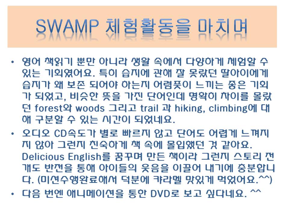 ¼­Á¤¹Î Á¤¸» ¸¹Àº ³ë·ÂÀÌ º¸À̴ üÇè Èı⿹¿ä ¿Ã¸®ºñ¾Æ°¡ ÀÌÁ¨ Á¦´ë·Î ¾ó±¼µµ º¸¿©ÁÖ¸ç ¿µ¾î¿¡ ¸ôÀÔÀ» Çß³ªºÁ¿ä ÃàÇϵå·Á¿ä Ȱ¿ëµµ ¾ËÂ÷°í  ÄÄÇ»ÅÍ È°¿ë½Ç·Âµµ ´ë´ÜÇϽó׿ä~~ ÀÌÁ¨ °ÆÁ¤ÀÌ ³¯¾Æ°¡°Ú¾î¿ä Ç㸮µµ ¾ÆÇÁ½Åµ¥ ÀÌ·¸°Ô Èı⵵ ¸ÚÁö°Ô ÇØÁÖ½Ã´Ï Àúµµ ¿­½ÉÈ÷ ÇØ¾ß°Ú´Ù´Â »ý°¢À̵å³×¿ä ÀÚ±Ø ¹Þ°í °©´Ï´Ù~~~ ¤»¤» ¿ì¼öÀÛ ±â´ëÇØº¼²²¿ä!!
