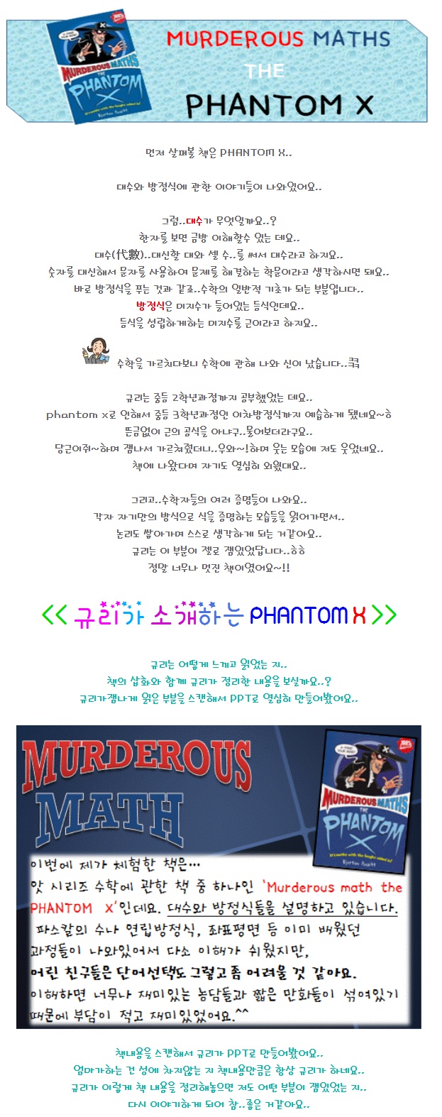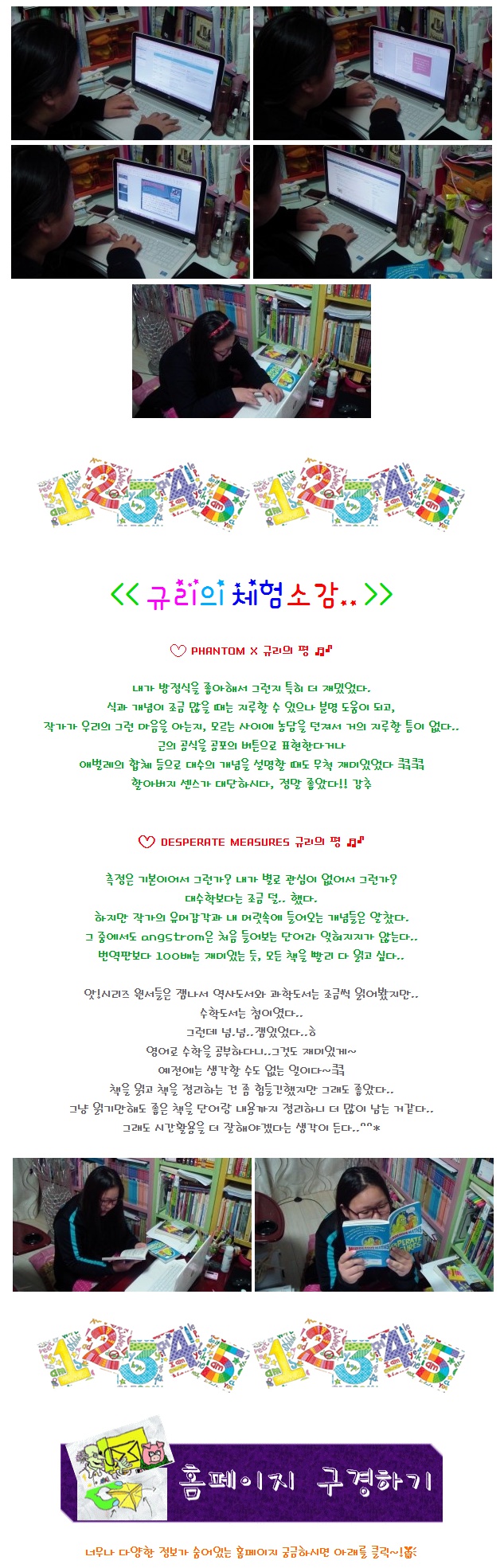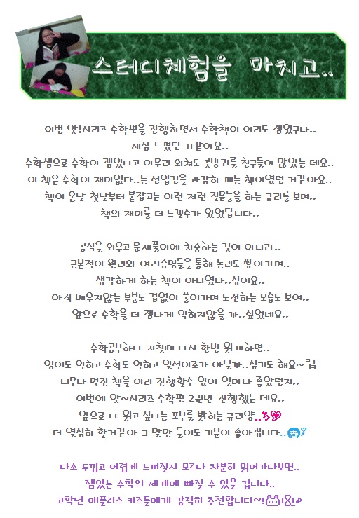 ¼öÇÐ, ¿äÁò ¾î¶»°Ô Á¢±ÙÇØ¾ßÇϳª »ý°¢À» ¸¹ÀÌ ÇÏ´Â °ú¸ñÀÌ¿¡¿ä. ÁÁ´Ù´Â ¹æ¹ýµéÀ» ±â¿ô°Å¸®¸ç ¾Ë¾Æº¸°í ÀÖ¾î¿ä. ±×·¯±â¿¡ ¼öÇм±»ý´ÔÀÎ ´ÔÀ̤§´õ¿í ºÎ·´°í ¸ÚÁ®º¸¿©¿ä. ÇÑ±Û Èı⸸ ºÁµµ ¾ÆÁ÷Àº ¿ì¸®¾ÆÀÌ¿¡°Ô ½Ã±â»óÁ¶³×¿ä. ±Ô¸®, ¿µ¾îµµ ÀßÇϰí Ã¥µµ ¸¹ÀÌ ÀÐ°í ¼º½ÇÇÏ°í ±àÁ¤ÀÇ ¿¡³ÊÁö°¡ ³ÑÄ¡´Â ¸ÚÁø Ä£±¸Àε¥ ¼öÇбîÁö ÀßÇÏ´Ï ±Ô¸®¾È¸»·Î ÄýÄ«¿¡¿ä. ¹ÙÀ̿ø°µµ ÀßÇϳ×^^ ´«À¸·Î¸¸ ºÁµµ ÈÖµÕ±×·¹Áý´Ï´Ù. ¼öÇм±»ý´ÔÀÌ º¸´Â ¼öÇÐüÇè ÈÄ±â ±× ±íÀ̰¡ ´À²¸Á®¿ä. ¾ðÁ¦½Ã°£ µÇ½Ç ¶§ ¼öÇп¡ ´ëÇØ ±Û Á» ¿Ã·ÁÁÖ¼¼¿ä^^¢¾