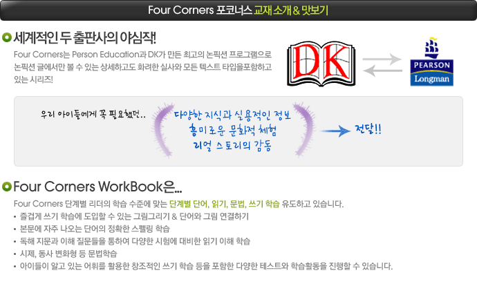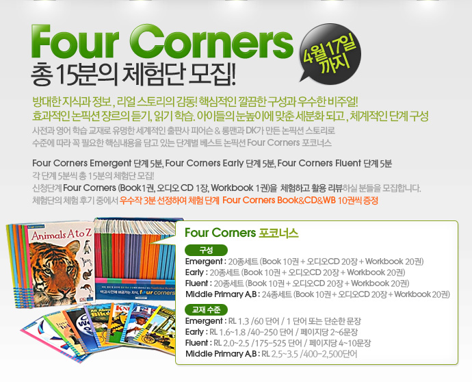 4. ¿À·£¸¸¿¡ ¸¸³ªº¸´Â °úÇÐ À̸ÓÀü¸®´õÀÔ´Ï´Ù. °úÇÐÀ̸ÓÀü ¸®´õ Á¾·ù°¡ ¸¹±â´Â ÇÏÁö¸¸¼±¶æ ¾ÆÀÌ¿Í ±³À縦 »ç¼ º¸°í ÀÖÁö´Â ¾Ê½À´Ï´Ù. ¿µ¾î Àб⿡ Àç¹Ì¸¦ ºÙÀÌ´Â ´Ü°è¶ó¼ ÀÏ´Ü ½¬¿î °Í ¿ì¼±À¸·Î Çϰí Àִµ¥ Four corners ¸®´õ¸¦ º¸´Ï »çÁøÀÚ·áµµ ÁÁ°í ±Û¹ä°í Àû¾î ¾ÆÀÌ¿Í Ã¼ÇèÇϱ⿡ ÁÁÀº ±³Àç°¡ µÉ°Í °°½À´Ï´Ù.¿öÅ©ºÏµµ ÇØº¼¸¸ÇØ º¸À̴µ¥ ¼Æò±âȸ¸¦ÁÖ½Å´Ù¸é ¾ÆÀÌ¿Í ³íÇȼǸ®´õ µµÀü±â·Î »ï°í ½Í½À´Ï´Ù.