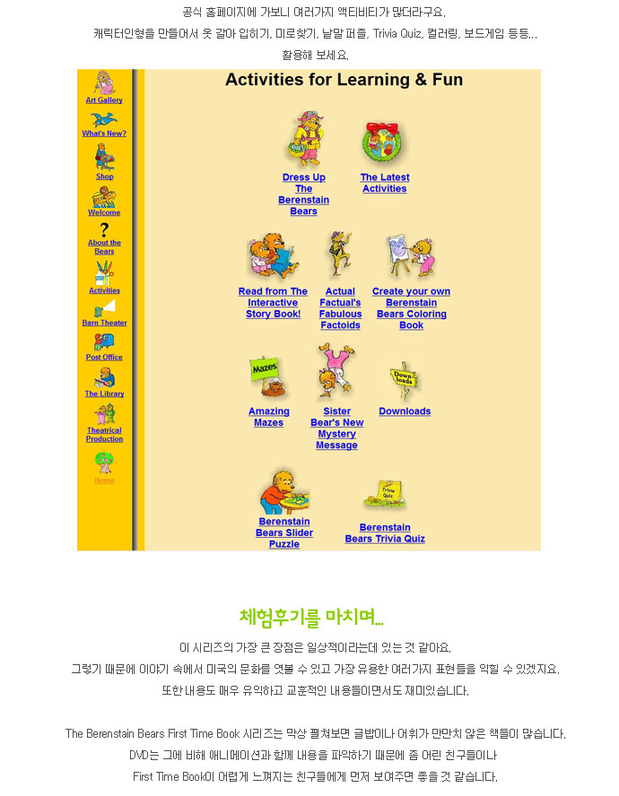 <P align=center><IMG src="/shop/lib/meditor/../../data/editor/1327439933.jpg"> </P> <P align=center><EMBED id=NFPlayer12530 height=300 name=NFPlayer12530 type=application/x-shockwave-flash width=420 src=http://serviceapi.nmv.naver.com/flash/NFPlayer.swf?vid=5D8CBD573F21C5F107C604CC676647DAE467&outKey=V12843be930056aeab765ec7d05d0bc42e4b92e4bf218d1742ebcec7d05d0bc42e4b9 wmode="transparent" allowScriptAccess="always" allowFullScreen="true"></P> <P align=center> </P> <P align=center><A href="https://www.berenstainbears.com/"><STRONG><FONT color=#ff0000>https://www.berenstainbears.com/</FONT></STRONG></A></P> <P align=center><IMG src="/shop/lib/meditor/../../data/editor/1327440068.jpg"></P>