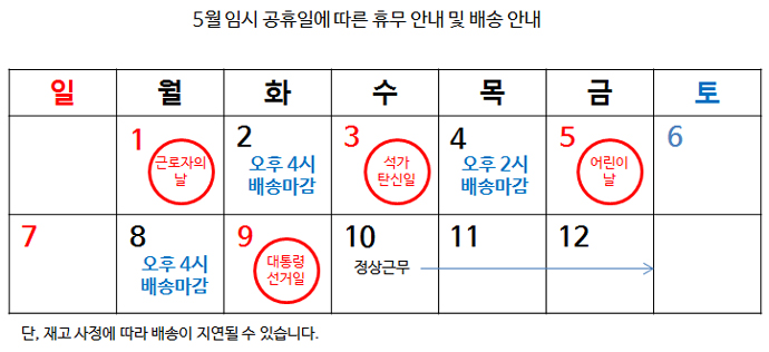 5¿ù 2ÀÏ(È), 4ÀÏ(¸ñ), 8ÀÏ(¿ù)ÀÇ °æ¿ì Åùè»çÀÇ »çÁ¤À¸·Î Æò¼Òº¸´Ù ºü¸¥ ½Ã°£¿¡ ¹è¼Û ¾÷¹«¸¦ ¸¶°¨ÇÕ´Ï´Ù.