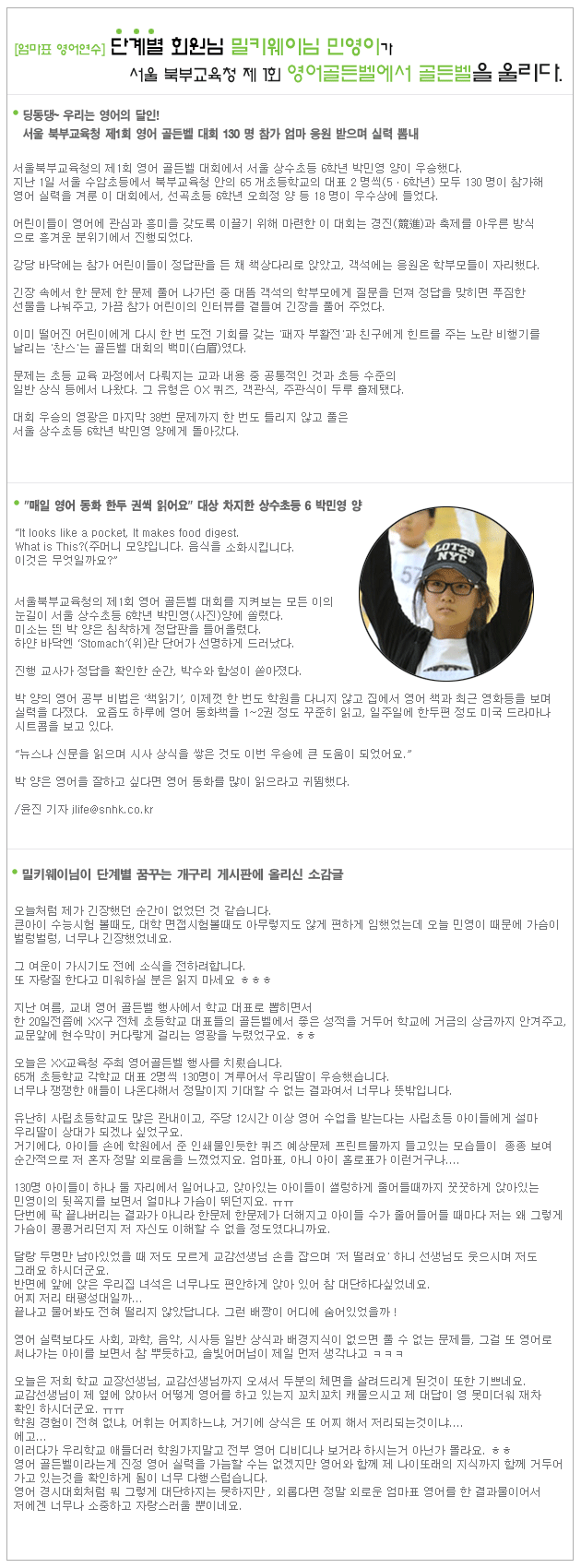 ¹ÐŰ¿þÀÌ´Ô ¹Î¿µÀ̰¡ ¼¿ï ºÏºÎ±³À°Ã» Á¦ 1ȸ ¿µ¾î°ñµçº§À» ¿ï¸®´Ù.