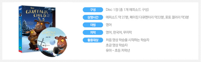 The Gruffalo’s Child DVD´Â À¯¸í ÀÛ°¡ Julia DonaldsonÀÇ ±×¸²µ¿ÈÃ¥À» ¿øÀÛÀ¸·Î ÇÑ ¾Ö´Ï¸ÞÀÌ¼Ç ÀÔ´Ï´Ù. µû¶æÇÑ °¨µ¿À» µ¿ÈÃ¥À¸·Î Çѹø, ¿µ»óÀ¸·Î ¶Ç Çѹø ´À³¥ ¼ö ÀÖ½À´Ï´Ù. |