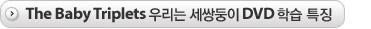 The Baby Triplets ¿ì¸®´Â ¼¼½ÖµÕÀÌ DVD¿¡¼´Â ¸Å ¿¡ÇǼҵåÀÇ ¸¶Áö¸· ºÎºÐ¿¡ À̾߱âÀÇ ³»¿ë Áß¿¡ ¼Ò°³µÇ¾ú´ø ÇÙ½É ´Ü¾îµéÀÇ ¸®ºä°¡ ÀÖ¾î¼ ¾ÆÀ̵éÀÇ ±âÃÊ ±¸¹® ÇнÀ°ú ´Ü¾î ÇнÀ °øºÎ¿¡ È¿°úÀûÀ¸·Î Ȱ¿ëÇÒ ¼ö ÀÖ½À´Ï´Ù.