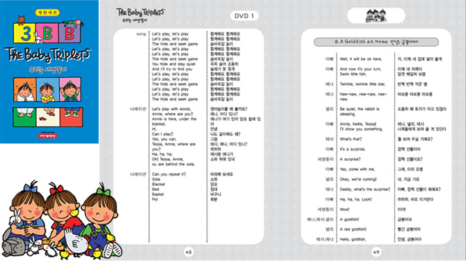 The Baby Triplets ¿ì¸®´Â ¼¼½ÖµÕÀÌ DVD¿¡´Â ¿µÇÑ ´ëº»ÀÌ Æ÷ÇԵǾî ÀÖ¾î DVD ÇнÀ °úÁ¤ Áß, ¶Ç´Â ÇнÀ ÁøÇà ÀÌÈÄ ÀÌÇØ È®ÀÎ ÇнÀ°ú Àбâ & ¼¼ºÎ ÀÌÇØ ÇнÀ ÁøÇàÀÌ °¡´ÉÇÕ´Ï´Ù. DVD¸¦ º¸´Â °úÁ¤ Áß ¾ÆÀ̰¡ ±Ã±ÝÇØ ÇÏ°í ¾Ë°í ½Í¾î ÇÏ´Â Àå¸éÀÇ ³»¿ë ÀÌÇØ¸¦ µ½±â À§ÇÏ¿© ´ëº»À» Ȱ¿ëÇÏ¿© ¿µ¾î·Î ÀÐ¾î º¸°í ³ª¼ Çѱ۷Π¶æÀ» È®ÀÎÇÏ¸ç ¶Ç ´ëº»¿¡ ³ª¿Â ÁÖ¿ä Ç¥ÇöµéÀ» »Ì¾Æ¼ ¹Ýº¹ÇÏ¿© ÇнÀÇÒ ¼öµµ ÀÖ½À´Ï´Ù.
