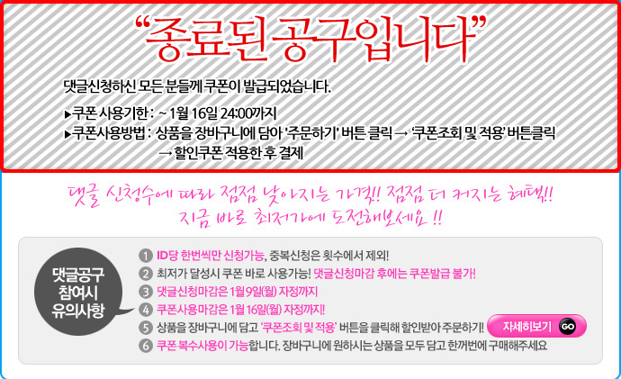 ¡Ú ÃÖÀú°¡°¡ ´Þ¼ºµÇ¾ú½À´Ï´Ù.^^ Áö±ÝºÎÅÍ ÄíÆù»ç¿ëÀÌ °¡´ÉÇÕ´Ï´Ù~. ¾ÆÁ÷ ½Åû¾ÈÇϽŠºÐµéÀº ¸¶°¨Àü¿¡ ´ñ±Û·Î ½ÅÃ»ÇØÁֽøé, ÄíÆù¹ß±Þ°ú µ¿½Ã¿¡ ¹Ù·Î »ç¿ëÇÏ½Ç ¼ö°¡ ÀÖ½À´Ï´Ù^^¡Ú |