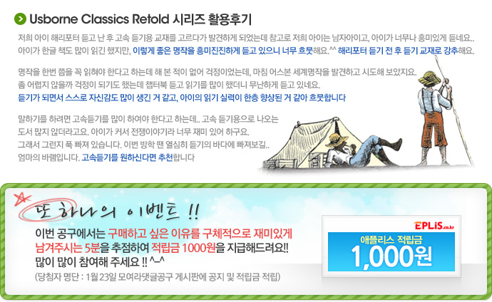 108     À¯Áö¼ö ¡Ú°ø±¸½Åû ¸¶°¨µÇ¾ú½À´Ï´Ù. ¸¹Àº ºÐµéÀÌ Âü¿©ÇØ Áּż­ USBORNE CLASSICS RETOLD½Ã¸®Áî ¿ª½Ã ÃÖÀú°¡¿¡ ´Þ¼ºµÇ¾ú½À´Ï´Ù. ^^ Âü¿©ÇØÁֽЏðµç ºÐµé²² °¨»çµå¸³´Ï´Ù.¡Ú