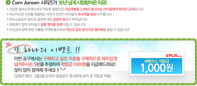 ¡ÚÃà!! ÃÖÀú°¡´Þ¼º!! Cam Jansen ½Ã¸®Áî°¡ ÃÖÀú°¡¿¡ ´Þ¼ºµÇ¾ú½À´Ï´Ù.^^ Áö±ÝºÎÅÍ ¹Ù·Î ÄíÆù»ç¿ëÀÌ °¡´ÉÇÏ¿À´Ï ÄíÆùÀ» Àû¿ëÇÏ¿© ÃÖÀú°¡¿¡ ±¸¸ÅÇØ Áֽñ⠹ٶø´Ï´Ù.¡Ú |