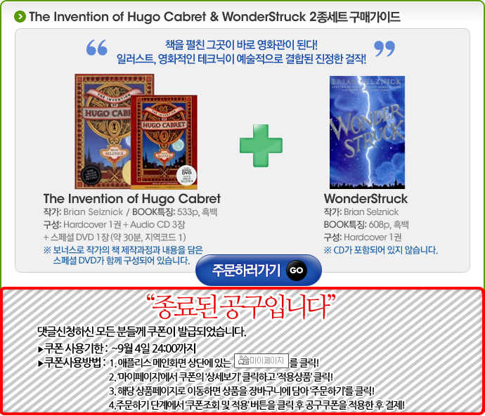 [´ñ±Û°ø±¸] Á¾·á[´ñ±Û°ø±¸ 169Â÷] The invention of Hugo Cabret & WondrerSturck 2Á¾¼¼Æ® (¸¶°¨:~8¿ù28ÀÏ) |