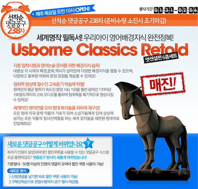 [´ñ±Û°ø±¸] Á¾·á[¼±Âø¼ø ´ñ±Û°ø±¸ 238Â÷] Usborne Classic Retold ¿§¼¾¼ÈÆí 6Á¾¼¼Æ® (±â°£: ~2/6 ±îÁö) |