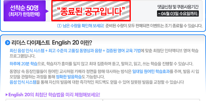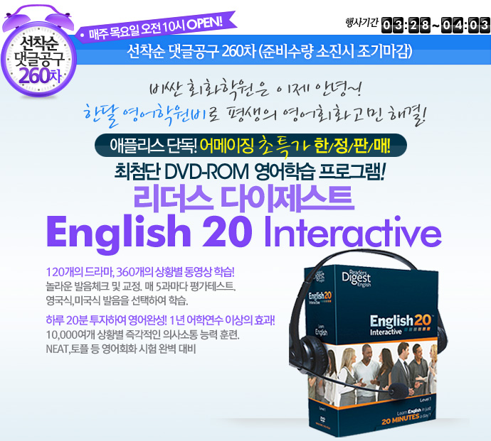 [´ñ±Û°ø±¸] Á¾·á[¼±Âø¼ø ´ñ±Û°ø±¸ 260Â÷] ¸®´õ½º ´ÙÀÌÁ¦½ºÆ® Enlish 20 DVD-ROM ¿µ¾îȸÈÇнÀ ÇÁ·Î±×·¥ (±â°£:~4/3±îÁö) |