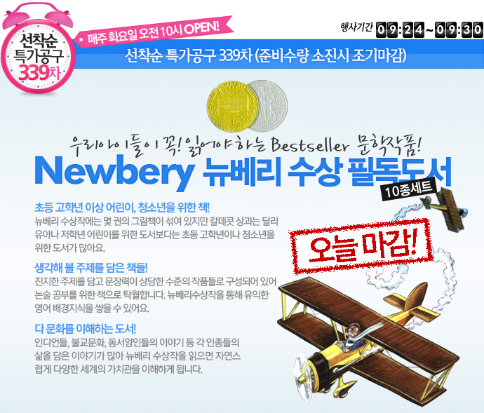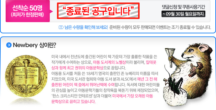 <table width="690" border="0" cellspacing="0" cellpadding="0"> <tr> <td><img src="/KIZ/etc/img2/kongu130924_Newbery01.jpg" width="690" height="589" border="0"></td> </tr> <tr> <td><img src="/KIZ/etc/img2/kongu130924_Newbery02.jpg" width="690" height="539"></td> </tr> <tr> <td height="63" align="right" style="background:url(/KIZ/etc/img2/kongu130924_Newbery02a.jpg) no-repeat top left;vertical-align:top;padding-right:19px;padding-top:13px;"> <table width="360" border="0" cellspacing="0" cellpadding="0"> <tr> <td width="239"><iframe width="180" height="39" frameborder="no" scrolling="no" src="/shop/proc/stock_call.php?goodsno=34944"></iframe></td> <td width="161"><a href="/shop/goods/goods_view.php?&goodsno=34944"><img src="/KIZ/etc/img2/kongu130110_btn.jpg" width="161" height="39" border="0"></a></td> </tr> </table></td> </tr> <tr> <td><img src="/KIZ/etc/img2/kongu130924_Newbery03.jpg" width="690" height="353" border="0"></td> </tr> <tr> <td height="44" style="background:url(/KIZ/etc/img2/kongu130924_Newbery04.jpg) no-repeat top left;vertical-align:bottom;text-align:right;padding-right:18px;"><SCRIPT type=text/javascript>MediaPlayer('','C_BridgeToTerabithia_1p.m4a',222,26,true);</SCRIPT></td> </tr> <tr> <td><img src="/KIZ/etc/img2/kongu130924_Newbery05.jpg" width="690" height="499"></td> </tr> <tr> <td><img src="/KIZ/etc/img2/kongu130924_Newbery06.jpg" width="690" height="485"></td> </tr> <tr> <td><img src="/KIZ/etc/img2/kongu130903_Spiderwick08.jpg" width="690" height="149" border="0" usemap="#guide"></td> </tr> </table> <map name="guide"> <area shape="rect" coords="508,7,688,49" href="#m" onClick="javascript:window.open('/KIZ/etc/kongu111229_buyingGuide.html','','width=683, height=600, scrollbars=yes')" onFocus="this.blur();"> </map>