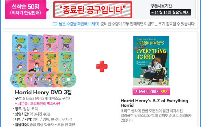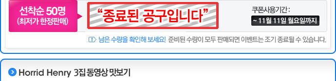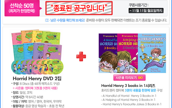 <table width="690" border="0" cellspacing="0" cellpadding="0"> <tr> <td><img src="/KIZ/etc/img2/kongu131105_HorridHenry01.jpg" width="690" height="527" border="0"></td> </tr> <tr> <td><img src="/KIZ/etc/img2/kongu131105_HorridHenry02.jpg" width="690" height="381" border="0" usemap="#gift1"></td> </tr> <tr> <td height="64" style="background:url(/KIZ/etc/img2/kongu131105_HorridHenry03.jpg) no-repeat top left;vertical-align:top;padding-right:18px;padding-top:11px;" align="right"> <table width="350" border="0" cellspacing="0" cellpadding="0"> <tr> <td width="229"><iframe width="180" height="39" frameborder="no" scrolling="no" src="/shop/proc/stock_call.php?goodsno=26927"></iframe></td> <td width="161"><a href="/shop/goods/goods_view.php?&goodsno=26927"><img src="/KIZ/etc/img2/kongu130110_btn.jpg" width="161" height="39" border="0"></a></td> </tr> </table></td> </tr> <tr> <td><img src="/KIZ/etc/img2/kongu131105_HorridHenry04.jpg" width="690" height="435" border="0" usemap="#gift2"></td> </tr> <tr> <td height="64" style="background:url(/KIZ/etc/img2/kongu131105_HorridHenry03.jpg) no-repeat top left;vertical-align:top;padding-right:18px;padding-top:11px;" align="right"> <table width="350" border="0" cellspacing="0" cellpadding="0"> <tr> <td width="229"><iframe width="180" height="39" frameborder="no" scrolling="no" src="/shop/proc/stock_call.php?goodsno=26933"></iframe></td> <td width="161"><a href="/shop/goods/goods_view.php?&goodsno=26933"><img src="/KIZ/etc/img2/kongu130110_btn.jpg" width="161" height="39" border="0"></a></td> </tr> </table></td> </tr> <tr> <td><img src="/KIZ/etc/img2/kongu131105_HorridHenry05.jpg" width="690" height="435" border="0" usemap="#gift3"></td> </tr> <tr> <td height="64" style="background:url(/KIZ/etc/img2/kongu131105_HorridHenry03.jpg) no-repeat top left;vertical-align:top;padding-right:18px;padding-top:11px;" align="right"> <table width="350" border="0" cellspacing="0" cellpadding="0"> <tr> <td width="229"><iframe width="180" height="39" frameborder="no" scrolling="no" src="/shop/proc/stock_call.php?goodsno=38468"></iframe></td> <td width="161"><a href="/shop/goods/goods_view.php?&goodsno=38468"><img src="/KIZ/etc/img2/kongu130110_btn.jpg" width="161" height="39" border="0"></a></td> </tr> </table></td> </tr> <tr> <td><img src="/KIZ/etc/img2/kongu131105_HorridHenry06.jpg" width="690" height="167"></td> </tr> <tr> <td height="261" align="center" style="background:url(/KIZ/etc/img2/kongu131105_HorridHenry07.jpg) no-repeat top left;vertical-align:top;"><table width="646" border="0" cellspacing="2" cellpadding="0"> <tr> <td width="325" height="243" valign="top"><SCRIPT type=text/javascript>MediaPlayer('','HH326.mp4',325,243,true);</SCRIPT></td> <td width="315" valign="top"></td> </tr> </table></td> </tr> <tr> <td><img src="/KIZ/etc/img2/kongu131001_HorridHenry06.jpg" width="690" height="730" border="0" usemap="#view"></td> </tr> <tr> <td><img src="/KIZ/etc/img2/kongu130903_Spiderwick08.jpg" width="690" height="149" border="0" usemap="#guide"></td> </tr> </table> <map name="guide"> <area shape="rect" coords="508,7,688,49" href="#m" onClick="javascript:window.open('/KIZ/etc/kongu111229_buyingGuide.html','','width=683, height=600, scrollbars=yes')" onFocus="this.blur();"> </map> <map name="view"> <area shape="rect" coords="14,446,136,481" href="/shop/board/view.php?id=contents&search[subject]=on&search[word]=horrid&no=484" target="_blank" onFocus="this.blur();"> <area shape="rect" coords="307,637,431,672" href="/shop/board/view.php?id=contents&search[subject]=on&search[word]=horrid&no=485" target="_blank" onFocus="this.blur();"> </map> <map name="gift1"> <area shape="rect" coords="451,241,591,277" href="/shop/goods/goods_view.php?goodsno=38413" target="_blank" onFocus="this.blur();"> </map> <map name="gift2"> <area shape="rect" coords="447,293,591,330" href="/shop/goods/goods_view.php?goodsno=38413" target="_blank" onFocus="this.blur();"> </map> <map name="gift3"> <area shape="rect" coords="450,294,589,331" href="/shop/goods/goods_view.php?goodsno=38413" target="_blank" onFocus="this.blur();"> </map>