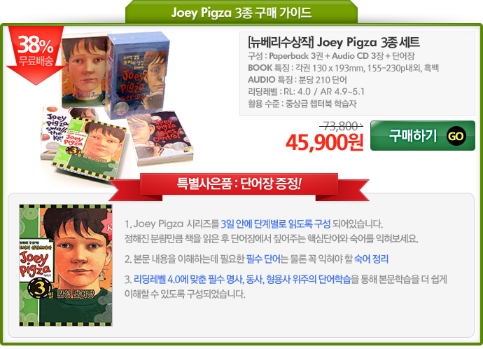 <table width="690" border="0" cellspacing="0" cellpadding="0"> <tr> <td><img src="/shop/data/skin/season2/etc/img/spkongu140702_JoeyPigza01.jpg" width="690" height="461"></td> </tr> <tr> <td><img src="/shop/data/skin/season2/etc/img/spkongu140702_JoeyPigza02.jpg" width="690" height="498" border="0" usemap="#prod"></td> </tr> <tr> <td><img src="/shop/data/skin/season2/etc/img/spkongu140702_JoeyPigza03.jpg" width="690" height="391"></td> </tr> <tr> <td><img src="/shop/data/skin/season2/etc/img/spkongu140702_JoeyPigza03a.jpg" width="690" height="468"></td> </tr> <tr> <td height="221" valign="top" background="/shop/data/skin/season2/etc/img/spkongu140702_JoeyPigza04.jpg" style="text-align:right;padding-right:28px;"><script type="text/javascript">media02('mms://educakorea.cafe24.com/educakorea/Chapter/Newbery/JoeyPigza/C_1_3p.wma',320,26);</script></td> </tr> </table> <map name="prod"> <area shape="rect" coords="520,166,685,222" href="/shop/goods/goods_view.php?&goodsno=20566" target="_blank" onFocus="this.blur();"> </map>