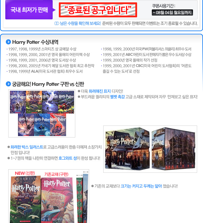 <TABLE cellSpacing=0 cellPadding=0 width=690 border=0> <TBODY> <TR> <TD><IMG border=0 src="/shop/data/skin/season2/etc/img/kongu140729_HarryPotter01.jpg" width=690 height=578></TD></TR> <TR> <TD style="VERTICAL-ALIGN: bottom; BACKGROUND: url(/shop/data/skin/season2/etc/img/kongu140729_HarryPotter02.jpg) no-repeat left top; PADDING-BOTTOM: 10px; PADDING-RIGHT: 19px" height=278 align=right> <TABLE cellSpacing=0 cellPadding=0 width=350 border=0> <TBODY> <TR> <TD width=229></TD> <TD width=161><A href="/shop/goods/goods_view.php?&goodsno=40343"><IMG border=0 src="/shop/data/skin/season2/etc/img/kongu130110_btn.jpg" width=161 height=39></A></TD></TR></TBODY></TABLE></TD></TR> <TR> <TD style="VERTICAL-ALIGN: bottom; BACKGROUND: url(/shop/data/skin/season2/etc/img/kongu140729_HarryPotter03.jpg) no-repeat left top; PADDING-BOTTOM: 10px; PADDING-RIGHT: 19px" height=322 align=right> <TABLE cellSpacing=0 cellPadding=0 width=350 border=0> <TBODY> <TR> <TD width=229></TD> <TD width=161><A href="/shop/goods/goods_view.php?&goodsno=40307"><IMG border=0 src="/shop/data/skin/season2/etc/img/kongu130110_btn.jpg" width=161 height=39></A></TD></TR></TBODY></TABLE></TD></TR> <TR> <TD style="VERTICAL-ALIGN: bottom; BACKGROUND: url(/shop/data/skin/season2/etc/img/kongu140729_HarryPotter04.jpg) no-repeat left top; PADDING-BOTTOM: 10px; PADDING-RIGHT: 19px" height=354 align=right> <TABLE cellSpacing=0 cellPadding=0 width=350 border=0> <TBODY> <TR> <TD width=229> </TD> <TD width=161><A href="/shop/goods/goods_search.php?searched=Y&log=1&skey=all&sort=txt3&sword=newharrypotterwithcd&____HiddenControl="><IMG border=0 src="/shop/data/skin/season2/etc/img/kongu130110_btn.jpg" width=161 height=39></A></TD></TR></TBODY></TABLE></TD></TR> <TR> <TD style="VERTICAL-ALIGN: bottom; BACKGROUND: url(/shop/data/skin/season2/etc/img/kongu140729_HarryPotter05.jpg) no-repeat left top; PADDING-BOTTOM: 10px; PADDING-RIGHT: 19px" height=322 align=right> <TABLE cellSpacing=0 cellPadding=0 width=350 border=0> <TBODY> <TR> <TD width=229> </TD> <TD width=161><A href="/shop/goods/goods_search.php?searched=Y&log=1&skey=all&sort=txt3&sword=newharryonlybook&____HiddenControl="><IMG border=0 src="/shop/data/skin/season2/etc/img/kongu130110_btn.jpg" width=161 height=39></A></TD></TR></TBODY></TABLE></TD></TR> <TR> <TD style="VERTICAL-ALIGN: bottom; BACKGROUND: url(/shop/data/skin/season2/etc/img/kongu140729_HarryPotter06.jpg) no-repeat left top; PADDING-BOTTOM: 10px; PADDING-RIGHT: 19px" height=322 align=right> <TABLE cellSpacing=0 cellPadding=0 width=350 border=0> <TBODY> <TR> <TD width=229> </TD> <TD width=161><A href="/shop/goods/goods_search.php?searched=Y&log=1&skey=all&sort=txt3&sword=harryoldversion&____HiddenControl="><IMG border=0 src="/shop/data/skin/season2/etc/img/kongu130110_btn.jpg" width=161 height=39></A></TD></TR></TBODY></TABLE></TD></TR> <TR> <TD><IMG border=0 src="/shop/data/skin/season2/etc/img/kongu140729_HarryPotter07.jpg" width=690 height=780></TD></TR> <TR> <TD><IMG border=0 src="/KIZ/etc/img2/kongu140415_HarryPotter08.jpg" width=690 height=510 useMap=#down></TD></TR> <TR> <TD><IMG src="/KIZ/etc/img2/kongu140415_HarryPotter09.jpg" width=690 height=659></TD></TR> <TR> <TD style="TEXT-ALIGN: left; PADDING-LEFT: 166px" height=91 vAlign=top background=/KIZ/etc/img2/kongu140415_HarryPotter10.jpg> <SCRIPT type=text/javascript>MediaPlayer('','harrypotter7.m4a',250,26,true);</SCRIPT> </TD></TR> <TR> <TD><IMG border=0 src="/shop/data/skin/season2/etc/img/kongu140624_Spiderwick07.jpg" width=690 height=142 useMap=#guide></TD></TR></TBODY></TABLE>