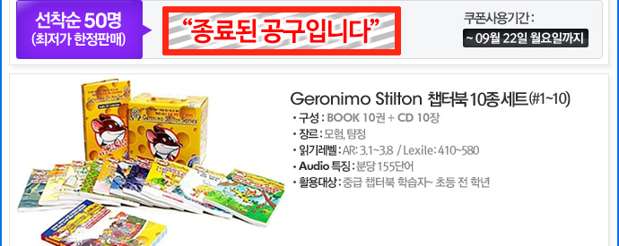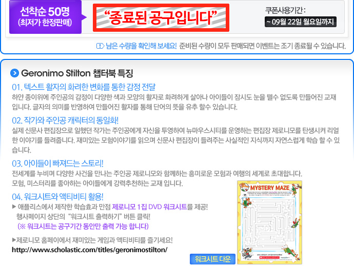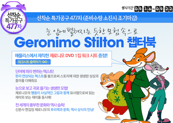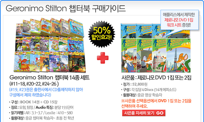 <TABLE cellSpacing=0 cellPadding=0 width=690 border=0> <TBODY> <TR> <TD><IMG border=0 src="/shop/data/skin/season2/etc/img/kongu140916_Geronimo01.jpg" width=690 height=492 useMap=#worksheet></TD></TR> <TR> <TD><IMG border=0 src="/KIZ/etc/img2/kongu140408_Geronimo02.jpg" width=690 height=412 useMap=#gift></TD></TR> <TR> <TD style="VERTICAL-ALIGN: top; BACKGROUND: url(/KIZ/etc/img2/kongu130516_GeronimoStilton04.jpg) no-repeat left top; PADDING-TOP: 0px; PADDING-RIGHT: 18px" height=47 align=right> <TABLE cellSpacing=0 cellPadding=0 width=350 border=0> <TBODY> <TR> <TD width=229></TD> <TD width=161><A href="/shop/goods/goods_view.php?&goodsno=37937"><IMG border=0 src="/shop/data/skin/season2/etc/img/kongu130110_btn.jpg" width=161 height=39></A></TD></TR></TBODY></TABLE></TD></TR> <TR> <TD><IMG border=0 src="/shop/data/skin/season2/etc/img/kongu140916_Geronimo03.jpg" width=690 height=275></TD></TR> <TR> <TD style="VERTICAL-ALIGN: top; BACKGROUND: url(/KIZ/etc/img2/kongu140408_Geronimo03a.jpg) no-repeat left top; PADDING-TOP: 0px; PADDING-RIGHT: 18px" height=47 align=right> <TABLE cellSpacing=0 cellPadding=0 width=350 border=0> <TBODY> <TR> <TD width=229></TD> <TD width=161><A href="/shop/goods/goods_view.php?&goodsno=21350"><IMG border=0 src="/shop/data/skin/season2/etc/img/kongu130110_btn.jpg" width=161 height=39></A></TD></TR></TBODY></TABLE></TD></TR> <TR> <TD><IMG border=0 src="/shop/data/skin/season2/etc/img/kongu140916_Geronimo04.jpg" width=690 height=519 useMap=#down></TD></TR> <TR> <TD><IMG src="/KIZ/etc/img2/kongu140408_Geronimo05.jpg" width=690 height=427></TD></TR> <TR> <TD style="VERTICAL-ALIGN: top; TEXT-ALIGN: right; PADDING-RIGHT: 20px" height=26> <SCRIPT type=text/javascript>MediaPlayer('','kongu120126_geronimo.m4a',222,26,true);</SCRIPT> </TD></TR> <TR> <TD><IMG border=0 src="/KIZ/etc/img2/kongu140408_Geronimo06.jpg" width=690 height=428 useMap=#view></TD></TR> <TR> <TD><IMG border=0 src="/KIZ/etc/img2/kongu140408_Geronimo07.jpg" width=690 height=345 useMap=#review></TD></TR> <TR> <TD><IMG border=0 src="/shop/data/skin/season2/etc/img/kongu140624_Spiderwick07.jpg" width=690 height=142 useMap=#guide></TD></TR></TBODY></TABLE>