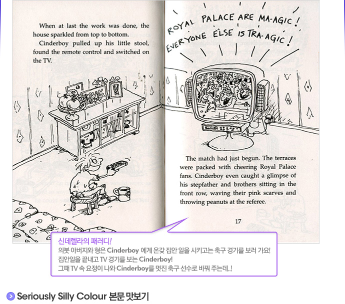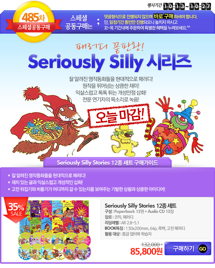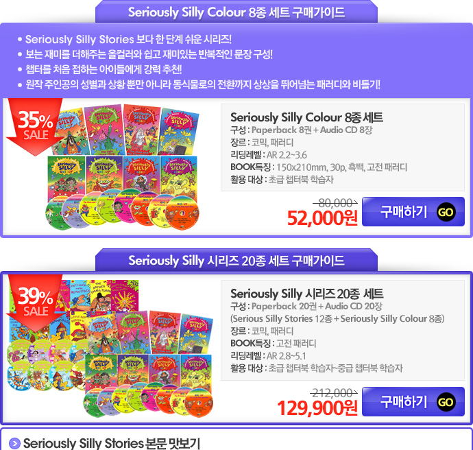 <TABLE cellSpacing=0 cellPadding=0 width=690 border=0> <TBODY> <TR> <TD><IMG border=0 src="/shop/data/skin/season2/etc/img/spkongu141013_SeriouslySilly01.jpg" width=690 height=860 useMap=#prod01></TD></TR> <TR> <TD><IMG border=0 src="/shop/data/skin/season2/etc/img/spkongu141013_SeriouslySilly02.jpg" width=690 height=656 useMap=#prod02></TD></TR> <TR> <TD style="VERTICAL-ALIGN: top; PADDING-BOTTOM: 0px; TEXT-ALIGN: right; PADDING-TOP: 0px; PADDING-LEFT: 0px; PADDING-RIGHT: 50px" height=26 background=/shop/data/skin/season2/etc/img/spkongu141013_SeriouslySilly03.jpg> <SCRIPT type=text/javascript>media02('http://www.kidsbooksejong.com/img_product/gongu/Silly Stories 12/9788949503851(Cinderboy).wma',320,26);</SCRIPT> </TD></TR> <TR> <TD><IMG src="/shop/data/skin/season2/etc/img/spkongu141013_SeriouslySilly04.jpg" width=690 height=609></TD></TR> <TR> <TD style="VERTICAL-ALIGN: top; PADDING-BOTTOM: 0px; TEXT-ALIGN: right; PADDING-TOP: 0px; PADDING-LEFT: 0px; PADDING-RIGHT: 50px" height=26 background=/shop/data/skin/season2/etc/img/spkongu141013_SeriouslySilly05.jpg> <SCRIPT type=text/javascript>media02('http://www.kidsbooksejong.com/img_product/gongu/silly-m01/Bleeping Beauty_01.wma',320,26);</SCRIPT> </TD></TR> <TR> <TD><IMG src="/shop/data/skin/season2/etc/img/spkongu141013_SeriouslySilly06.jpg" width=690 height=549></TD></TR> <TR> <TD><IMG border=0 src="/shop/data/skin/season2/etc/img/spkongu141013_SeriouslySilly07.jpg" width=690 height=726 useMap=#home></TD></TR></TBODY></TABLE>