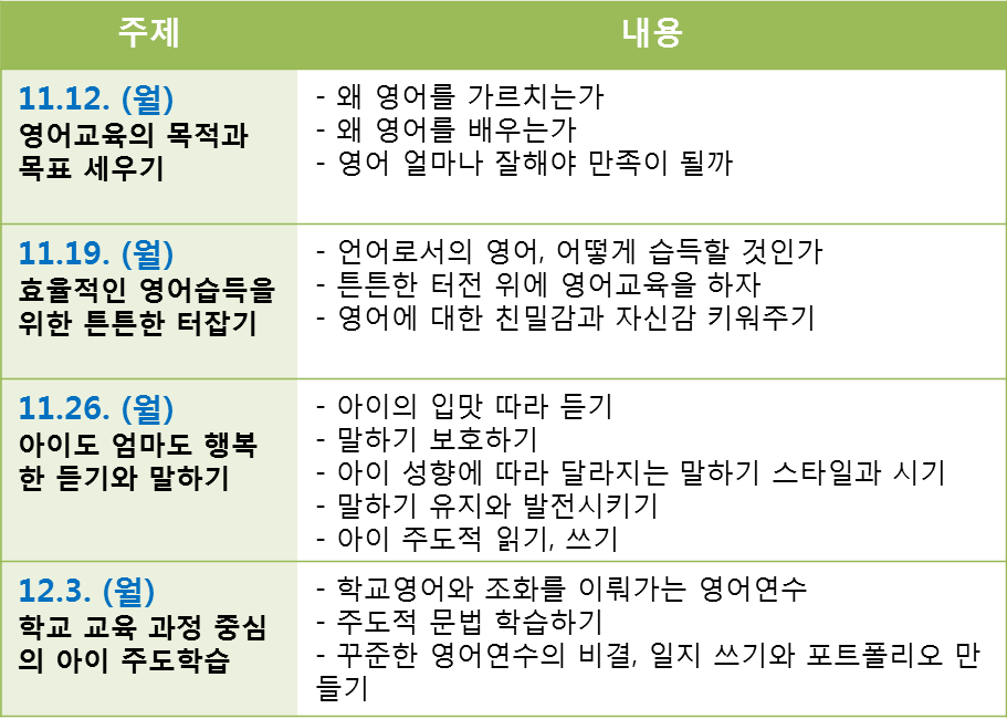 11. 12.(¿ù), 11. 19.(¼ö), 11. 26.(¿ù), 12. 3.(¿ù) 10½Ã~12½Ã