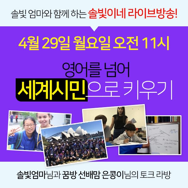 4¿ù 29ÀÏ(¿ù) ¿ÀÀü 11½Ã ¼ÖºûÀÌ³× Á¤±â ¶ó¹æ! ¿µ¾î¸¦ ³Ñ¾î ¼¼°è½Ã¹ÎÀ¸·Î Ű¿ì±â [¼Öºû¾ö¸¶´Ô°ú ÀºÄáÀÌ´Ô ÅäÅ© ¶ó¹æ] |