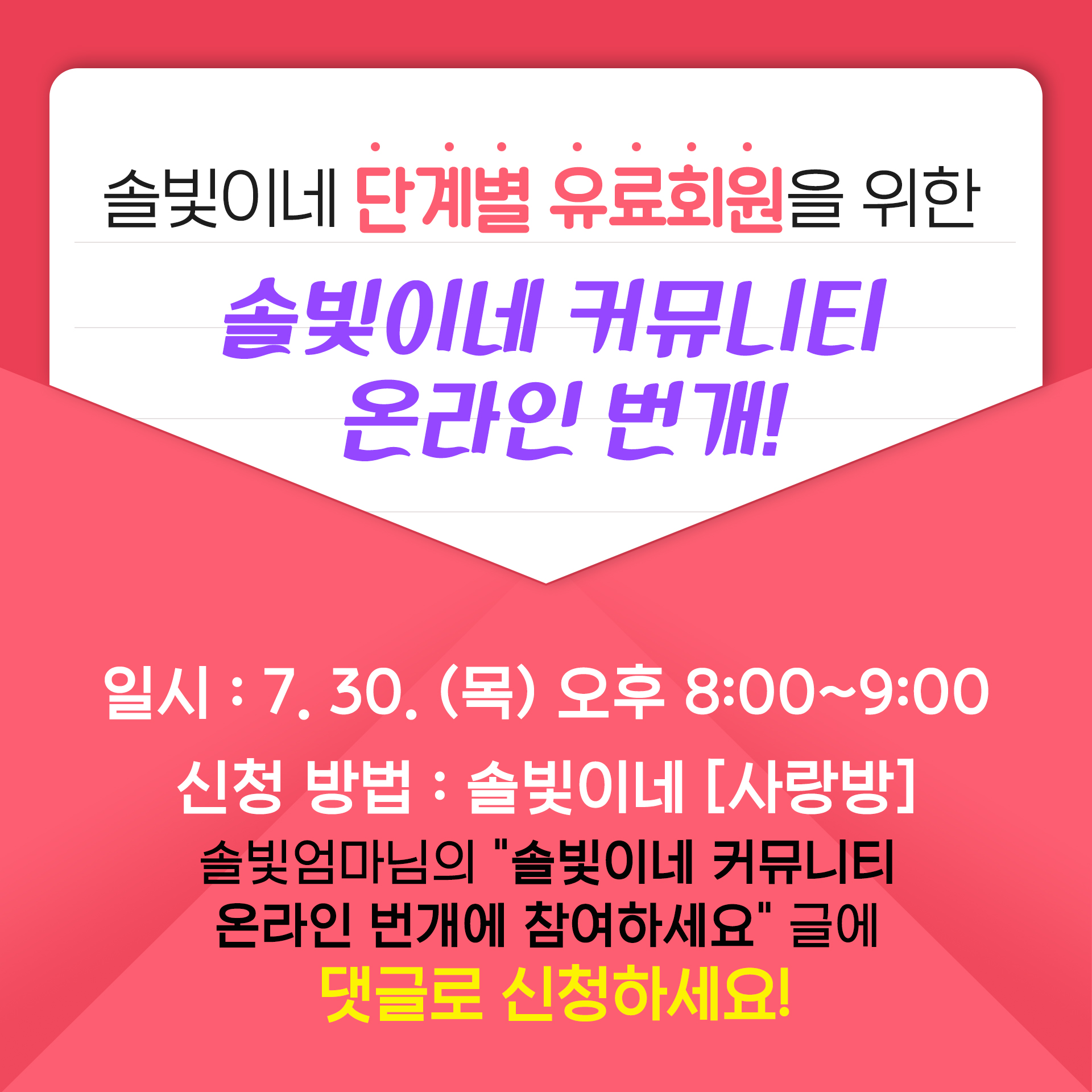 [7¿ù 30ÀÏ ¿Â¶óÀÎ ¹ø°³] ´Ü°èº° À¯·áȸ¿øÀ» À§ÇÑ ¼ÖºûÀÌ³× Ä¿¹Â´ÏƼ ¿Â¶óÀÎ ¹ø°³ |