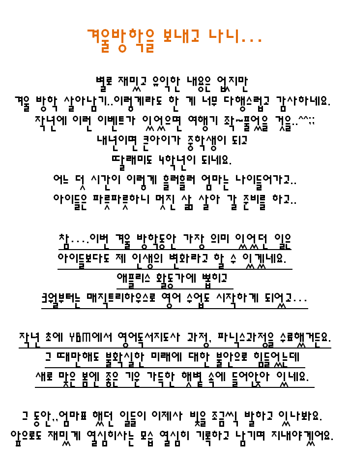2     ÃÖÁ¤¼ø °Ü¿ï¹æÇп¡ ¾ÆÀ̵é°ú ¾ÆÁÖ ¸¹Àº ÀÏÀ» Çϼ̳׿ä.