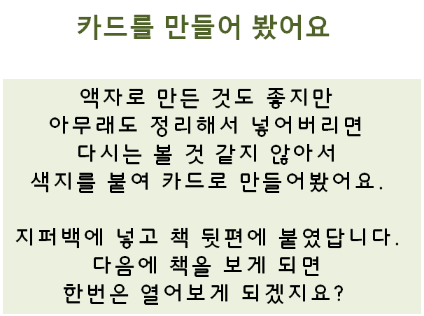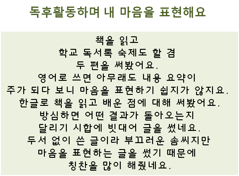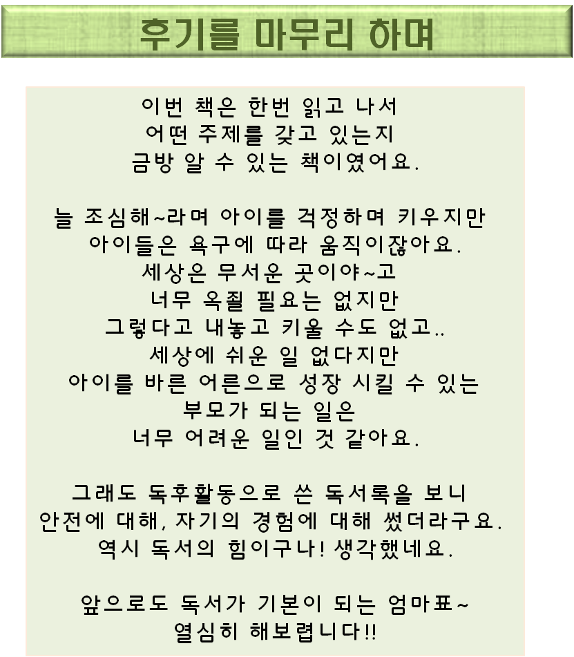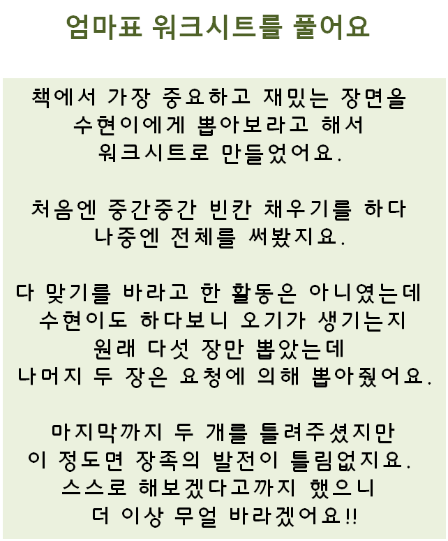 4     ä¹Ì¿µ ¼öÇöÀ̰¡ Ã¥À» ÀÐ°í µ¶ÈÄȰµ¿À» ³Ê¹« ÀßÇß¾î¿ä. »çÁøµµ, °¡·Î ä¿ö³õ±â, Ç¥Çö µîµî Âü ¾ËÂ÷³×¿ä. Àú·¸°Ô Çϸ鼭 ¾²±âµµ ½ºÆç¸µµµ, ¹®Àå ±¸Á¶µµ ¸Ó¸®¼Ó¿¡ ½ï½ï µé¾î°¡°Ú¾î¿ä. µ¶¼­·Ïµµ ´Ã ÇÏ´Â ¸»ÀÌÁö¸¸ Âü ÁÁÀº ½À°üÀÎ °Í °°¾Æ¿ä.