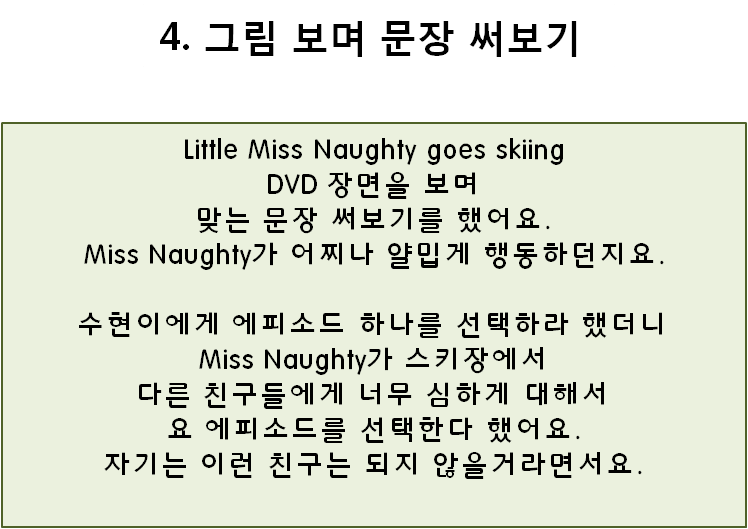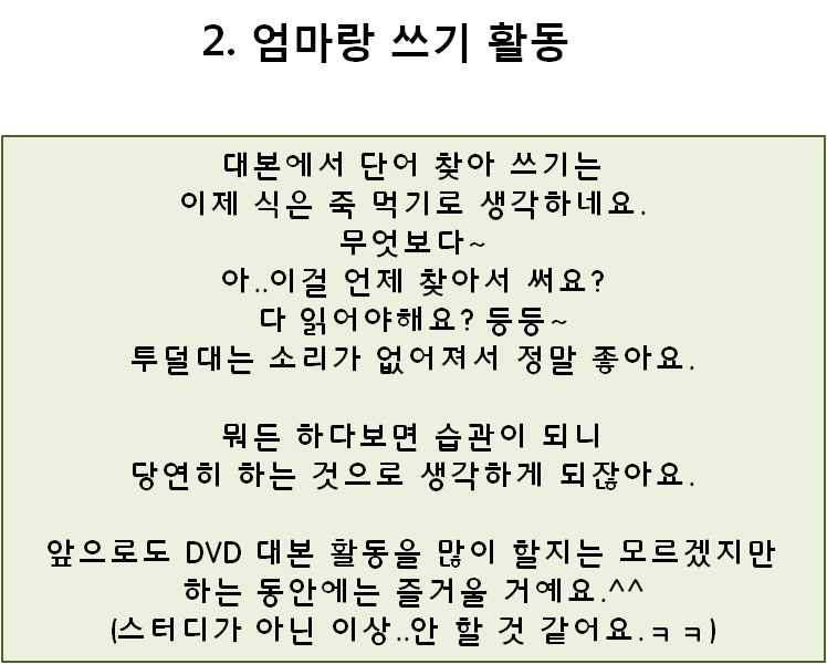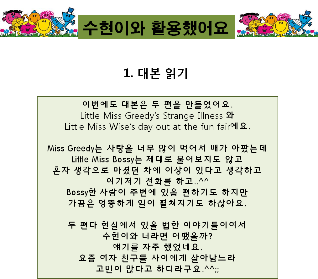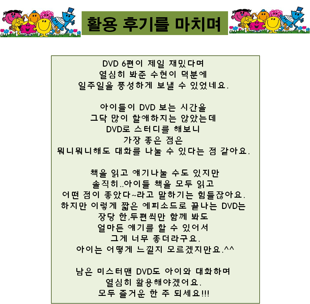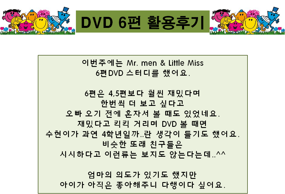ÇÇÅÍ´Ô ³Ê¹« ºÎÁö·±Çϼ¼¿ä. ¼öÇöÀ̶û ¸ÅÁÖ¸ÅÁÖ ¿½ÉÈ÷ ¿µ¾î¸¦ ÇØ¼ ±× °á°ú¹°À» ¿Ã¸®½Ã´Ï ¼öÇöÀÌÀÇ ¿µ¾îµµ Â÷±ÙÂ÷±Ù ½×ÀÔ´Ï´Ù. ¹Ì½ºÅÍ¸Ç DVD °£°áÇϸ鼵µ ¾ÆÀ̵é Àμº¸é¿¡¼ ¸¹Àº °ÍÀ» ¶°¿Ã¸®°Ô ÇØÁÖ¾î ÀúÈñÁý¿¡¼µµ ¾ÆÁÖ ÁÁ¾ÆÇØ¿ä. ³»¿ëÀÌ °£°áÇϸç ÄÚ¹ÍÇØ¼ ÁÁ¾ÆÇÕ´Ï´Ù. º¸´Â °Í¿¡¸¸ ±×Ä¡Áö ¾Ê°í ´ëº». ¿µ¾î·Î Ç¥ÇöÇØ º¸°Ô ÇÏ°í ¾ËÂù ÁøÇà±â¿´¾î¿ä. Àúµµ ±×¸²º¸°í ¿µ¾î·Î ½áº¸°Ô ÇØºÃ´Âµ¥ ¾ÆÀ̹ÝÀÀÀÌ ²Ï ±¦Âú¾Ò¾î¿ä.