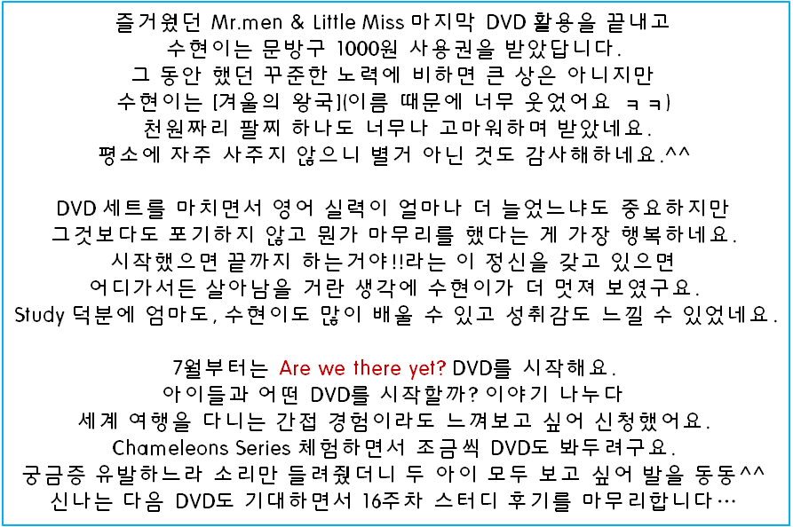 ´ÙÀ½¿¡ Ç®¾î³»ÁÖ½Ç Are you there yet? ±â´ëÇÒ²²¿ä. ÀúÈñÁý¿¡µµ Á¦°¡ °¡º¸°í ½ÍÀº À¯·´½Ã¸®Áî°¡ ÀÖ¾î¼ ¿½ÉÈ÷ º¸¾Ò¾î¿ä. ¿ì¸® ¼ÇöÀÌ, Àڱ⵵ ¿Àºü¶û °°ÀÌ Ã¼ÇèÇÏ´Â ¾ÆÀ̵éÀÌ µÇ¾î ³ª¶óµéÀ» ޹æÇÏ°í ½Í´Ù°í ³ë·¡¸¦ ºÒ·¶³×¿ä. ±×·¯±â¿¡ ³Ê¹« Ä¿¹ö·ÈÁö¸¸¿ä.~^^* |