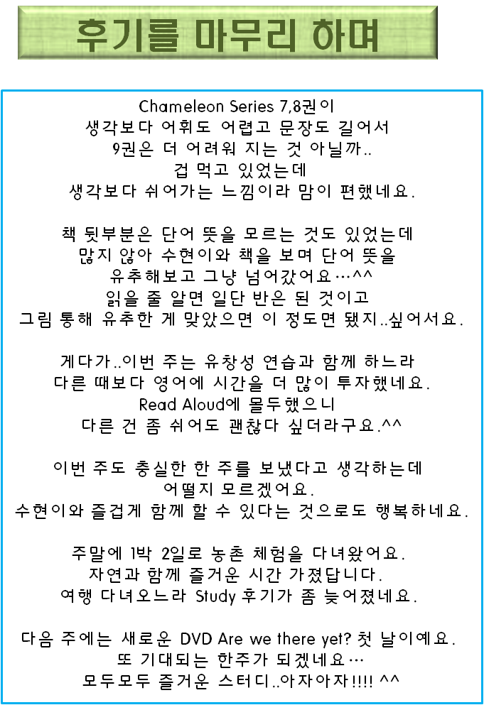 ÇÇÅÍ´Ô ºÎÁö·±µµ ÇϼŶó. ¹ú½á À̸¸ÅÀ̳ª ÁøÇàÇϼ̳׿ä. ÀÐ°í ³ª¼ ´Ù¾çÇÑ È°µ¿À¸·Î ¼öÇöÀ̰¡ ³Ê¹« ÁÁ¾Ò°Ú¾î¿ä. ºÒ±ÔÄ¢µµ Çѹø ¤¾îÁֽðí role play µµ Àç¹ÌÀÖ¾î º¸ÀÔ´Ï´Ù. ½ºÅ͵ð¸é ½ºÅ͵ð, üÇèÇнÀµµ Àç¹ÌÀÖ°Ô ÇϽðí Á¤¸» ºÎÁö·±Çϼ¼¿ä. ¾ÆÀ̵鿡°Ô ³óÃÌ Ã¼Çèµµ À¯ÀÍÇß°Ú¾î¿ä. ¼ÇöÀÌ´Â ¾ç°¡ ÇÒ¸Ó´ÏÁýÀÌ ´Ù ´ëµµ½Ã¿©¼ ³óÃÌ °¡°í ½Í´Ù°í ³ë·¡¸¦ ÇØ¿ä. ¿äÁòÀº µµ½Ã»ýȰ·Î ³óÃ̵µ üÇèÀ» ´Ù´Ï³×¿ä. »çÁøÀ» º¸´Ï ¿°»öµµ ÇÑ °Í °°°í °úÀϵµ µý °Í °°°í ¹» ¸ÀÀÖ´Â °Íµµ ¸¸µé¾î ¸ÔÀº °Í °°³×¿ä. Çàº¹ÇØ º¸¿©¿ä~^^* |