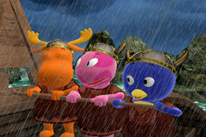 Rockabilly music meets medieval Nordic exploration! PABLO, TYRONE, and UNIQUA are Vikings on the high-seas. In search of new lands, they run into wild weather, and a mermaid (TASHA with a tail) who blocks their way. Will they discover new territory? And if they do, what will they name it? |
