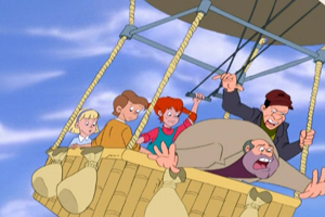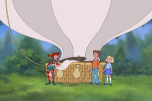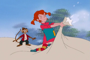 Pippi finds a hot air balloon in the attic and decides to try it out with Annika and Tommy. They fly to the next town and inadvertently manage to assist in the capture of two crooks. |