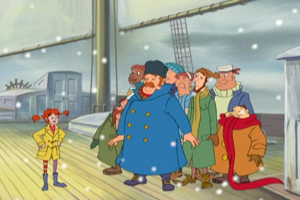 Captain Longstocking docks in the village to pick up Pippi and take her with him to the South Seas. Annika and Tommy are given permission to go along and they all set sail for adventure on the high seas. Pippi teaches the Settergren¡¯s about life on board, teaching them to be look-outs and how to manage a pirate attack. Unbeknownst to the Captain and crew, Thunder Karlson and Bloom are castaways yet again in search of their fortunes. Unfortunately, they get very sea sick and the fortune is not as easy to access as they had hoped. |