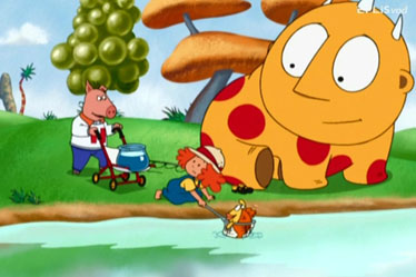 keep him for a pet. He puts Fishy in a baby carriage and takes him for a walk,