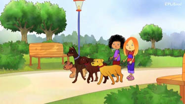 some dolls¡¯ toys. They start to walk some of the local dogs. But their