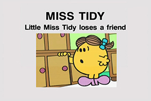 | Little Miss Tidy returns from holiday to find that Little Miss Trouble and Little Miss Tiny have invited themselves round to her house. True to form, Little Miss Tidy loses no time in putting her suitcases away in the cupboard but without realising that she has "tidied away" Little Miss Tiny in the process....