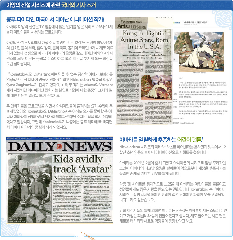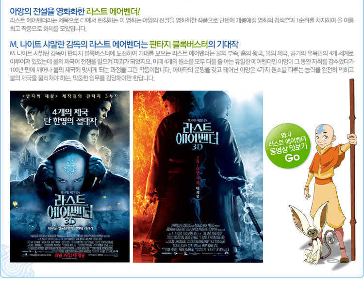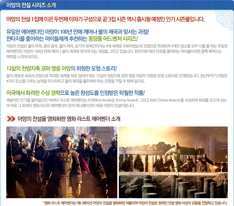 ¹Ì±¹¿¡¼ ¹æ¿µµÇ¾î Æø¹ßÀûÀÎ Àα⸦ ºÒ·¯ ÀÏÀ¸Å² ÆÇŸÁö ¾×¼Ç 3D ¾Ö´Ï¸ÞÀ̼ÇÀ¸·Î, ¿µÈ ¶ó½ºÆ® ¿¡¾îº¥´õ The Last AirbenderÀÇ ¿øÀÛ ¾Ö´Ï¸ÞÀ̼ÇÀÔ´Ï´Ù. EBS ±³À°¹æ¼Û Àα⠹濵ÀÛ, ¾Ö´Ï»ó, Emmy»ó µî È·ÁÇÑ ¼ö»ó °æ·ÂÀ¸·Î ³ôÀº ¿Ï¼ºµµ¸¦ ÀÎÁ¤¹Þ´Â ÀÛǰÀÔ´Ï´Ù.