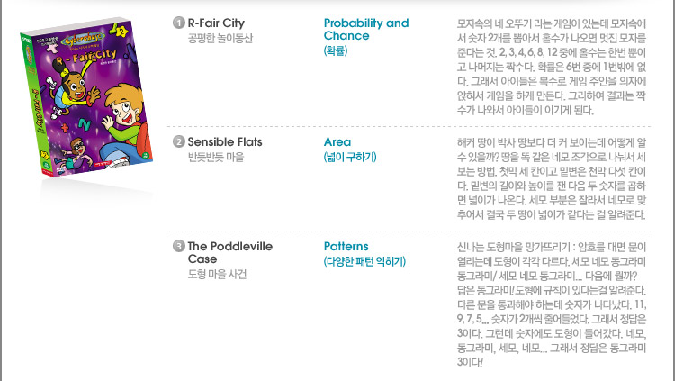 ¿µ¾î¿Í ¼öÇÐÀ» µ¿½Ã¿¡ ÇнÀÇÒ ¼ö ÀÖ´Â ÇнÀ¿ë DVDÀÔ´Ï´Ù. »çÀ̹ö ¼¼»ó¿¡¼­ ÆîÃÄÁö´Â ½Å³ª´Â ¸ðÇèÀ» ÅëÇØ ¼öÇÐÀÇ ¿ø¸®¿Í °³³äÀº ¹°·Ð ³í¸®ÀûÀÎ »ç°í¸¦ Ű¿öÁÖ´Â »õ·Î¿î ¼öÇÐ ¾Ö´Ï¸ÞÀ̼ÇÀÔ´Ï´Ù. ÃʵîÇлýµéÀÌ ¹Ýµå½Ã ¾Ë¾Æ¾ßÇÒ 12°¡ÁöÀÇ ¼öÇа³³äÀ» Èï¹ÌÁøÁøÇÑ ¸ðÇè°ú È­·ÁÇÑ ¿µ»óÀ¸·Î ¹è¿ï ¼ö ÀÖ½À´Ï´Ù.