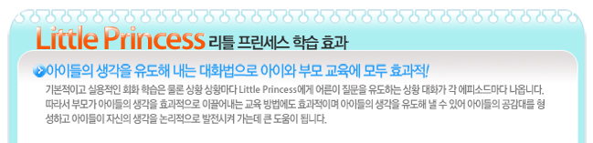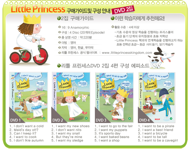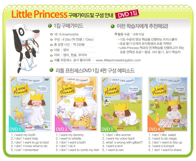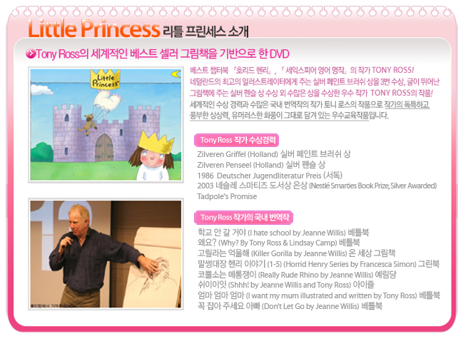 Tony RossÀÇ ¼¼°èÀûÀÎ º£½ºÆ® ±×¸²µ¿ÈÃ¥ Little Princess Story¸¦ ±âÃÊ·Î ÇÑ ÀÛǰÀ¸·Î, Å« ¿ôÀ½°ú ±³ÈÆÀ» µ¿½Ã¿¡ Á¦°øÇÏ´Â º£½ºÆ® ÇнÀ¿ë DVDÀÔ´Ï´Ù. ¿©À¯ÀÖ´Â ÁøÇà°ú ¼±¸íÇÏ°í ¶Ç·ÇÇÑ ¹ßÀ½À» ÅëÇØ È¿°úÀûÀÎ µè±â&È¸È ÇнÀÀ» ÇÒ ¼ö ÀÖ½À´Ï´Ù. ¶ÇÇÑ ÀÏ»ó »ýȰ¿¡¼ ÀϾ´Â ´Ù¾çÇÏ°í ½ÇÁ¦ÀûÀΠǥÇöÀ» ÇнÀÇÒ ¼ö ÀÖ½À´Ï´Ù.