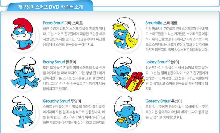 ½º¸ÓÇÁ Smurf Àü¼¼°èÀûÀ¸·Î ³Î¸® ¾Ë·ÁÁö°í, °¡Àå ¸¹Àº »ç¶ûÀ» ¹Þ°í Àִ ij¸¯ÅÍ, ½º¸ÓÇÁ À̾߱⸦ ´ãÀº ¾Ö´Ï¸ÞÀ̼Ç. Pierre Culliford, PeyoÀÇ °¡Àå Àß ¾Ë·ÁÁø ÀÛǰÀ¸·Î, °¡°¡¸á°úÀÇ À§Çèõ¸¸ÇÑ ½ºÅ丮°¡ Èï¹ÌÁøÁøÇÏ°Ô À̾îÁö´Â ¾Ö´Ï¸ÞÀ̼ÇÀÔ´Ï´Ù. ÄÚ¹ÍÇÑ À帣ÀÇ À̾߱⸦ ÁÁ¾ÆÇÏ´Â ¾ÆÀ̵鿡°Ô ÃßõÇÏ´Â »óǰÀÔ´Ï´Ù.