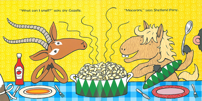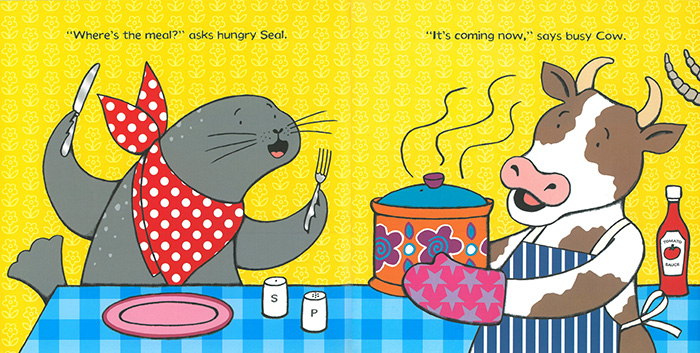 È­±â¾Ö¾ÖÇÑ ºÐÀ§±â¿¡ È­»çÇÑ ±×¸², ¶óÀÓÀ¸·Î ´õ¿í Àç¹ÌÀִ å °£°áÇÑ ´ëȭü·Î ÁøÇàµÇ´Â À̾߱â´Â Áö·çÇÒ Æ´ ¾øÀÌ Èê·¯°©´Ï´Ù. mousse-goose, meal-seal, now-cow ¸Å ÆäÀÌÁö µüµü ¸Â¾Æ ¶³¾îÁö´Â ¶óÀÓÀÌ ÀÖ¾î ¼Ò¸® ³»¾î Àд Àç¹Ì°¡ ÀÖ½À´Ï´Ù. óÀ½ºÎÅÍ ³¡±îÁö À̾îÁö´Â ³ë¶õ º®Áö¸¦ ÅëÇØ ¸ðµç µîÀåÀι°ÀÌ ÇÑ Å×ÀÌºí¿¡ ¾É¾Æ ÀÖÀ½À» ¾Ë ¼ö ÀÖ½À´Ï´Ù. ÆäÀÌÁö¸¶´Ù ¿À¸¥ÂÊ ³¡¿¡ ´ÙÀ½¿¡ µîÀåÇÒ µ¿¹°ÀÇ ÀϺθ¦ º¸¿©ÁÖ°í ¿ÞÂÊ ³¡¿¡´Â Àü ÆäÀÌÁö¿¡ ³ª¿Ô´ø µ¿¹°À» º¸¿©ÁÝ´Ï´Ù. ¸À±ò½º·¯¿î À½½Ä, ´Ù¾çÇÑ ¹«´Ì¿Í ÆÐÅÏÀ¸·Î È­»çÇÑ ±×¸© µîÀÇ ¼ÒǰÀÌ ÀÖ¾î Àд ³»³» ÇູÇÑ ±âºÐÀÌ µå´Â ±×¸²Ã¥ÀÔ´Ï´Ù.