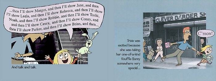 Trixie¿Í Knuffle BunnyÀÇ µÎ ¹øÂ° À̾߱â ÀÛ°¡ Mo Willems¿¡°Ô ¼¼ ¹øÂ° Caldecott Honor¸¦ ¼±»çÇÑ ÀÛǰÀ¸·Î ÀüÆí (¿ª½Ã Caldecott Honor ¼ö»óÀÛ)¿¡ µîÀåÇß´ø Trixie¿Í Knuffle bunny°¡ ±×´ë·Î µîÀåÇÕ´Ï´Ù. ¾Æ±â¿´´ø Trixie´Â À¯Ä¡¿ø»ýÀ¸·Î ÀÚ¶ú½À´Ï´Ù. ÆÇ±Ç ÆäÀÌÁö¿Í ŸÀÌÆ² ÆäÀÌÁö¿¡ µîÀåÇÏ´Â ¾×ÀÚµéÀº °ú°Å ¸ð½ÀÀ» º¸¿©Áָ鼭 ÀüÆí°ú ÀÚ¿¬½º·´°Ô ¿¬°áµË´Ï´Ù.