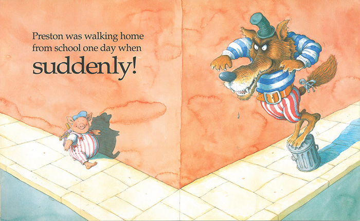 IntroductionA large, toothy, mean-looking wolf stalks Preston the Pig. But each time the wolf gets close, Preston the pig suddenly changes course and sneaks out from his pursuer.