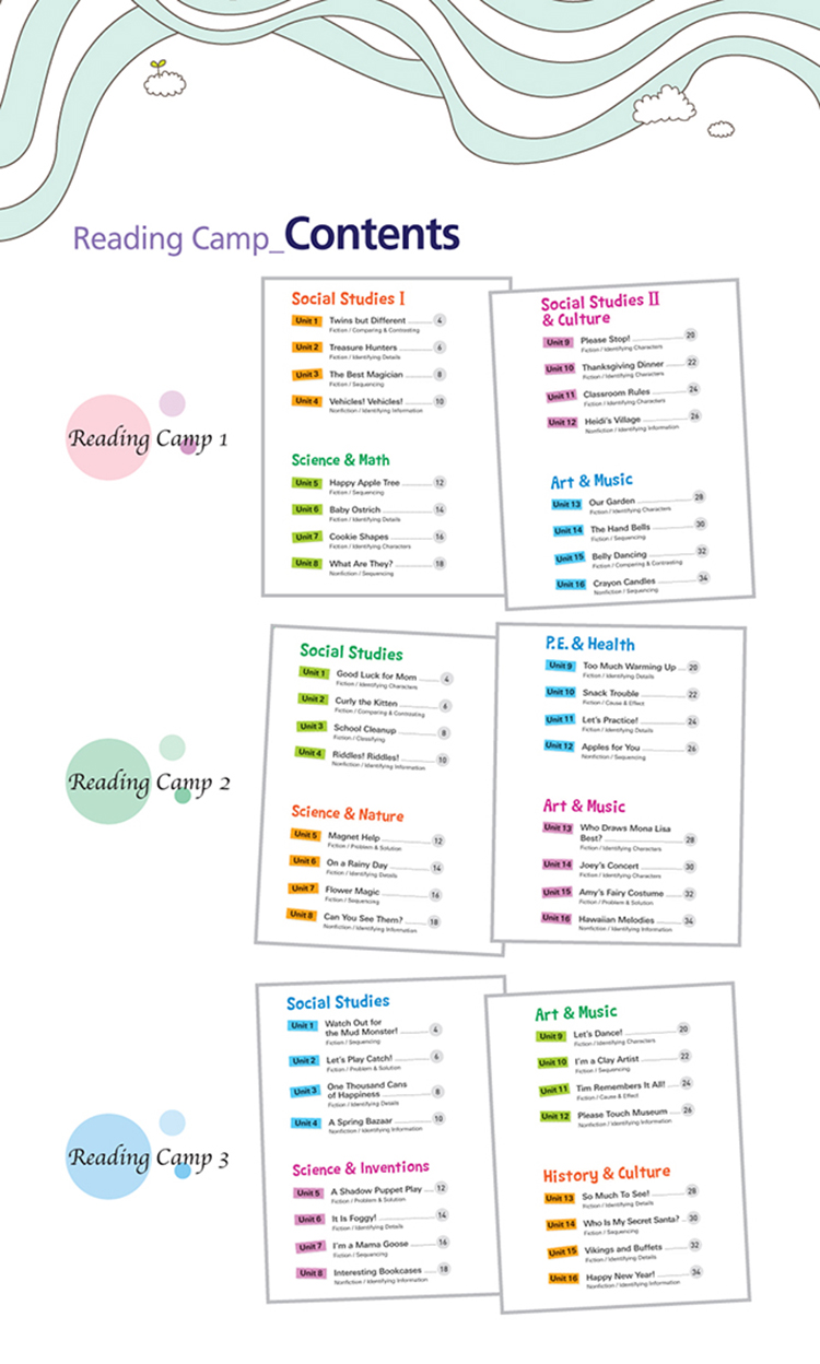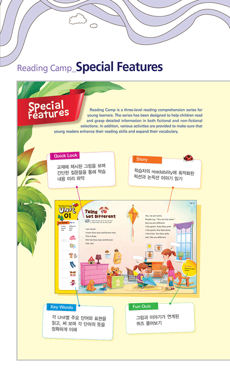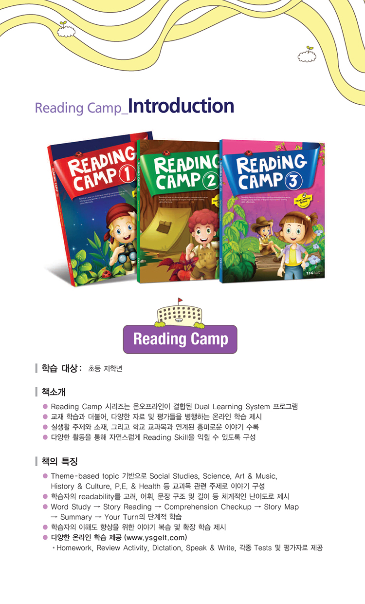 Reading Camp Series´Â ¿Â/¿ÀÇÁ ¶óÀÎÀÌ °áÇÕµÈ Dual Learning System ÇÁ·Î±×·¥À¸·Î½á, 3´Ü°è·Î ±¸¼ºµÈ Reading Comprehension Book SeriesÀÔ´Ï´Ù. ±³Àç ÇнÀ°ú ´õºÒ¾î, ´Ù¾çÇÑ ÀÚ·á ¹× Æò°¡µéÀ» º´ÇàÇØ º¸´Â ¿Â¶óÀÎ ÇнÀÀ» Á¦½ÃÇÏ¿©, ÇнÀ ¼ºÃëµµ¸¦ ±Ø´ëÈ­ÇÒ ¿µ¾î Àб⠱³ÀçÀÔ´Ï´Ù. ½Ç»ýȰ°ú À̾îÁø ÁÖÁ¦¿Í ¼ÒÀç, ±×¸®°í Çб³ ±³°ú¸ñ°ú ¿¬°èµÈ Èï¹Ì·Î¿î À̾߱âµéÀÌ ÇнÀÀÚµéÀÇ readability¸¦ °í·ÁÇÏ¿© ü°èÀûÀ¸·Î ³ª´µ¾î Á¦½ÃµË´Ï´Ù. ¶ÇÇÑ, ¿µ¾î Àб⿡ ÇʼöÀûÀÎ Reading SkillµéÀ» ´Ù¾çÇÑ È°µ¿À» ÅëÇØ ÀÚ¿¬½º·´°Ô ÀÍÈú ¼ö ÀÖµµ·Ï ±¸¼ºµÇ¾î ÀÖ½À´Ï´Ù.