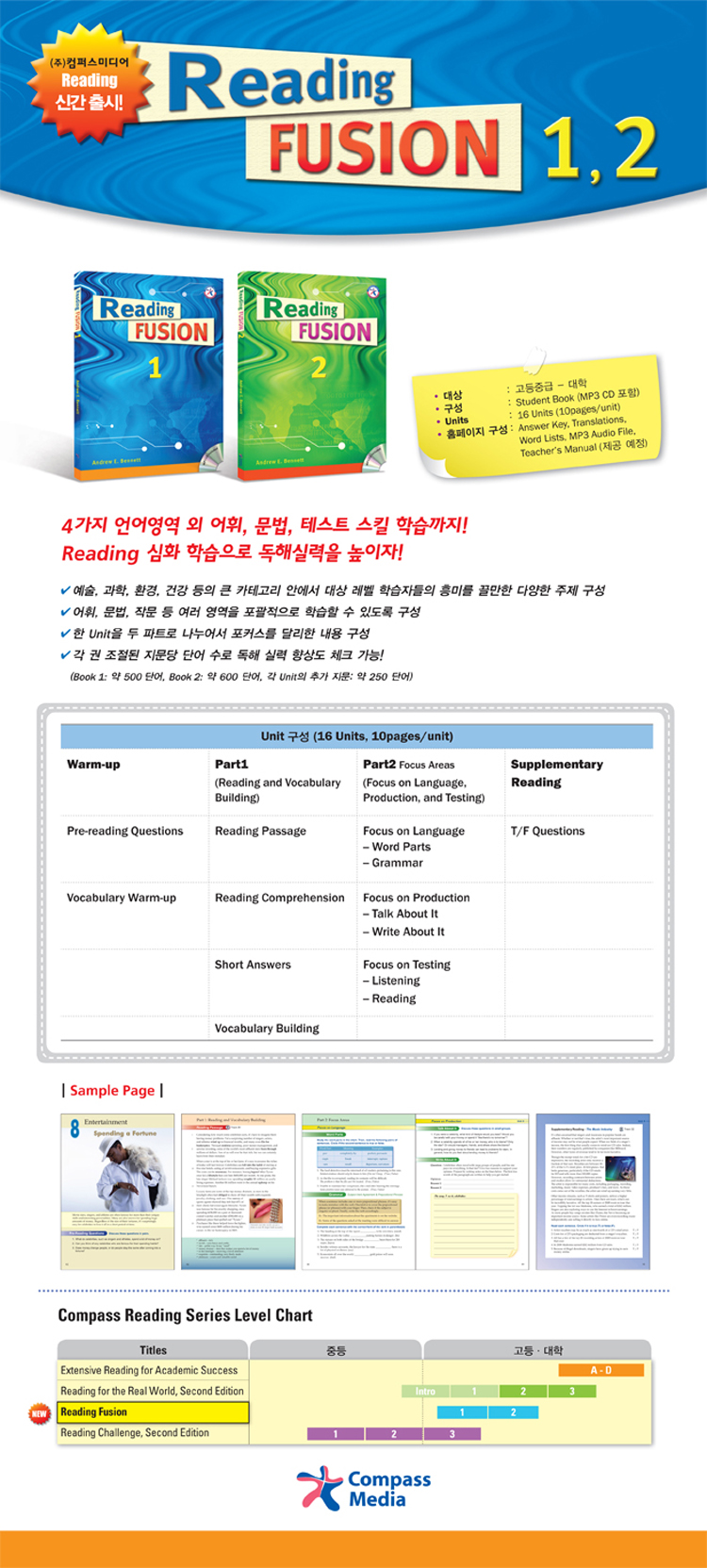 Reading FusionÀº ÃÑ 2±ÇÀ¸·Î ±¸¼ºµÈ ¸®µù ±³Àç·Î¼­, °íµî~´ëÇÐ ¼öÁØÀÇ ÇнÀÀÚµéÀ» À§ÇØ °í¾ÈµÈ ±³ÀçÀÌ´Ù. °¢ À¯´Ö´ç µÎ °³ÀÇ main reading passages ¿Í ´Ù¾çÇÏ°Ô ±¸¼ºµÈ ¿¬½À¹®Á¦¸¦ ÅëÇØ, ¿µ¾î ÇнÀÀÇ Àü ¿µ¿ª¿¡ °ÉÃÄ ÇÊ¿äÇÑ ½ºÅ³µéÀ» Æ÷°ýÀûÀ¸·Î ÇнÀÇÒ ¼ö ÀÖµµ·Ï ±¸¼ºµÇ¾ú´Ù. ¸®µù Áö¹®ÀÇ ÁÖÁ¦´Â ¿¹¼ú, °úÇÐ, ȯ°æ, °Ç°­ µîÀÇ Å« Ä«Å×°í¸® ¾È¿¡¼­ Ÿ°Ù ·¹º§ ÇнÀÀÚµéÀÇ Èï¹Ì¸¦ ²ø¸¸ÇÑ ´Ù¾çÇÑ À̽´µé·Î ¼±Á¤µÇ¾ú´Ù.