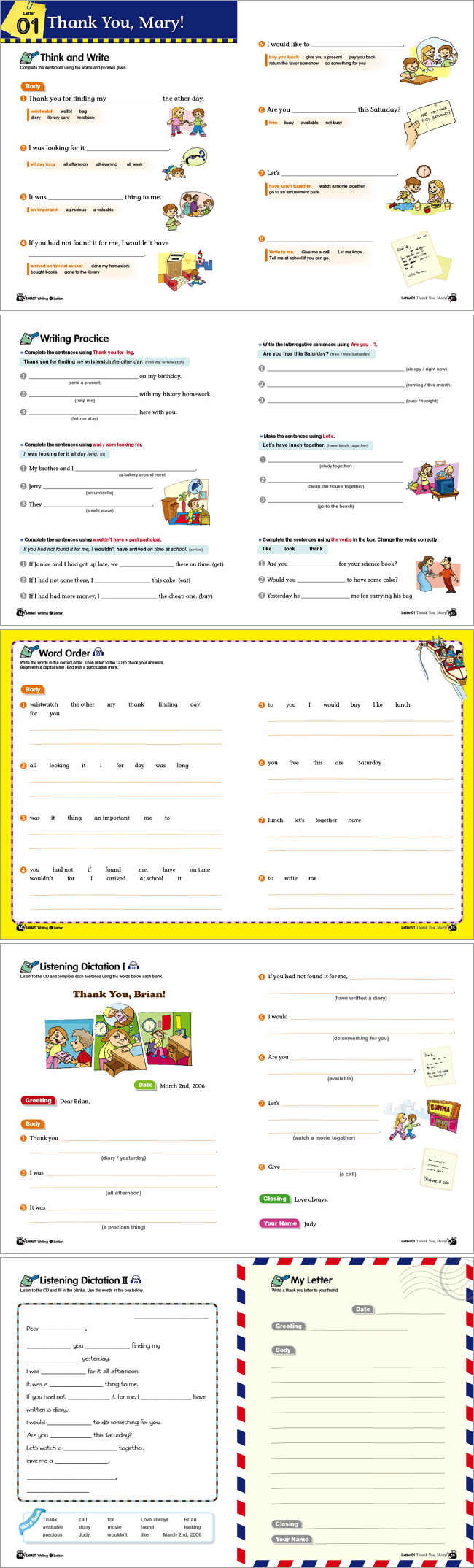 ½º¸¶Æ® ¶óÀÌÆÃ ½Ã¸®Áî´Â Àϱâ(Diary), ÆíÁö(Letter), µ¶Èݨ(Book Report), ¿¡¼¼ÀÌ(Essay) ÃÑ 4±ÇÀ¸·Î ±¸¼ºµÇ¾î ÀÖÀ¸¸ç, °¢ ±Ç¿¡¼­´Â ÃʵîÇлýµé¿¡°Ô Ä£¼÷ÇÑ ÅäÇÈ 6ÆíÀ» °ñ¶ó ÇнÀÇÒ ¼ö ÀÖµµ·Ï µÇ¾î ÀÖ´Ù. °¢ ±ÇÀÇ Ã¼°èÀûÀÎ ¾²±â ÇнÀ ´Ü°è¸¦ µû¶ó°¡´Ù º¸¸é ±âº»ÀûÀÎ ¹®Àå, ¹®´Ü ±¸¼º»Ó ¾Æ´Ï¶ó ÇÑ ÆíÀÇ Â¥ÀÓ»õ ÀÖ´Â ±ÛÀ» ¿Ï¼ºÇÒ ¼ö ÀÖ°Ô µÈ´Ù.