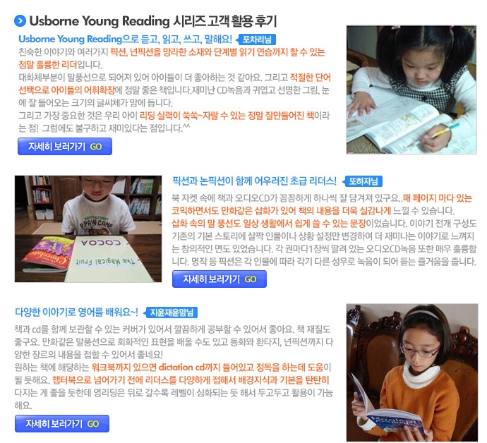 1´Ü°è¿¡ ÇØ´çÇϴ åµéÀº ÃÑ 48ÆäÀÌÁö·Î ¾óÇÍ º¸±â¿¡ ºÐ·®ÀÌ ¸¹¾Æ º¸ÀÌÁö¸¸, ±×¸²ÀÌ Â÷ÁöÇÏ´Â ºñÁßÀÌ ³ô°í, ¹®Àå ÀÚüµµ ±×´ÙÁö ¾î·ÆÁö ¾Ê¾Æ ½ÃÁß¿¡¼­ ¸¹ÀÌ º¼ ¼ö ÀÖ´Â Àб⠿¬½À¿ë ä°ú ºñ½ÁÇÑ ³­À̵µ ÀÔ´Ï´Ù.An I Can Read Book 1~2´Ü°è¸¦ Àç¹ÌÀÖ°Ô ÀÐÀ» ¼ö ÀÖ´Â ½Ç·ÂÀ̸é Usborne Young Readind ½Ã¸®Áî 1´Ü°èµµ ÃæºÐÈ÷ Àç¹ÌÀÖ°Ô º¼ ¼ö ÀÖ¾î¿ä.   2´Ü°è´Â 64ÆäÀÌÁö ±¸¼ºÀ¸·Î 1´Ü°è¿¡ ºñÇØ ³»¿ëÀÌ Á¶±Ý º¹ÀâÇϰí, ´Ü¾îÀÇ ³­À̵µµµ Á¶±Ý ³ô½À´Ï´Ù. ÇÏÁö¸¸, An I Can Read BookÀÇ 3´Ü°è¸¦ Àç¹ÌÀÖ°Ô ÀÐÀ» ¼ö ÀÖ´Â ½Ç·ÂÀ̶ó¸é ÃæºÐÈ÷ Áñ°Ì°Ô º¼ ¼ö ÀÖÀ¸¸ç ÃʱÞ-Áß±Þ »çÀÌÀÇ ½ºÅ丮ºÏÀ» ÃæºÐÈ÷ Á¢ÇÑ ¾ÆÀ̵éÀ̶ó¸é ÀÌÇØÇÒ ¼ö ÀÖ´ä´Ï´Ù.