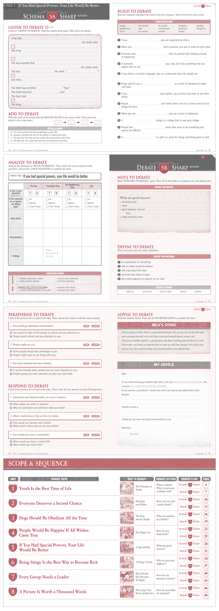 - ÇнÀÀÚµéÀº Âù, ¹Ý ³í°Å¸¦ ±¸¼ºÇϰí, °ø°ÝÇϰí, ´Ù½Ã À籸¼ºÇÏ´Â Åä·ÐÀÇ Áغñ°úÁ¤À» ÅëÇØ ½º½º·Î Âù, ¹ÝÀÇ ÀÔÀå¿¡¼­ Åä·ÐÇÏ°í »ó´ëÆÀÀ» Æò°¡Çϱâ±îÁö ¿ÏÀüÇÑ Åä·ÐÀÇ È帧À» ÇÑ °ú ³»¿¡¼­ °æÇèÇÏ°Ô µË´Ï´Ù. Debate Sharp´Â °¢ unit¿¡¼­ ´Ù¸¥ ÁÖÁ¦·Î ¸Å¹ø ¿ÏÀüÇÑ Åä·ÐÀÇ Àü °úÁ¤À» °æÇèÇÒ ¼ö Àֱ⠶§¹®¿¡, ±³Àç Àüü¸¦ ÅëÆ²¾î 1, 2¹øÀÇ Åä·ÐÀ» Çϵµ·Ï ¼³°èµÈ Ÿ Åä·Ð ±³Àçµé°ú Â÷º°È­ µË´Ï´Ù.