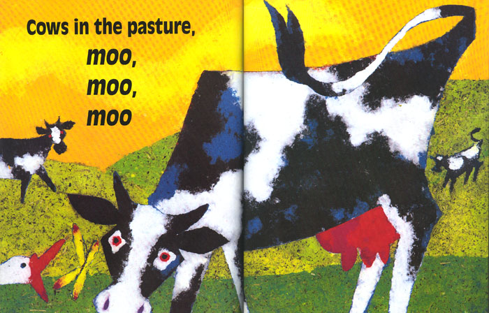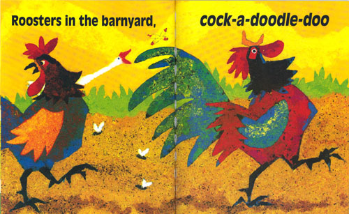 Moo moo. cock-a-doodle-doo. cluck cluck cluck, muck muck muck, mew mew, coo coo, squeak squeak, shriek shriek, hee haw haw, caw caw, chirp chirp, burp burp, honk honk.