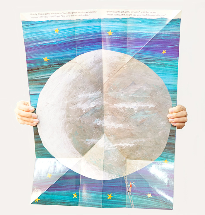 Introduction Monica wants to play with the moon, so her papa sets out to get it. Children will love the delightful story unfolding the page extending both outward and upward.