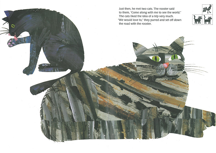 IntroductionA rooster sets off to see the world. Soon, he is joined by two cats, three frogs, four turtles, and five fish. But one group by one, they decide to head home.